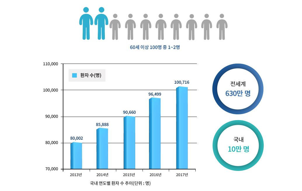 파킨슨병이란? 뇌에 도파민이라 불리는 신경전달 물질이 결핍되어 발생하는 질병. 운동기능장애를 수반하며, 갈수록 증세가 악화되며 우울증 및 언어장애를 동반하는 퇴행성 만성질환. 운동증상으로는 떨림, 운동 느림증, 경직, 자세 불안전성 등이 있으며, 비운동 증상으로는 정신장애와 자율신경기능장애 등 임상증상이 나타납니다.