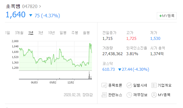 초록뱀의 최근 1년간 주가입니다. 이미 최근 1년간의 전 고점을 뚫었습니다. 더 올라갈 것이라 보기는 힘들겠지만 일정량의 반등은 충분히 노려볼만 하다고 생각됩니다.