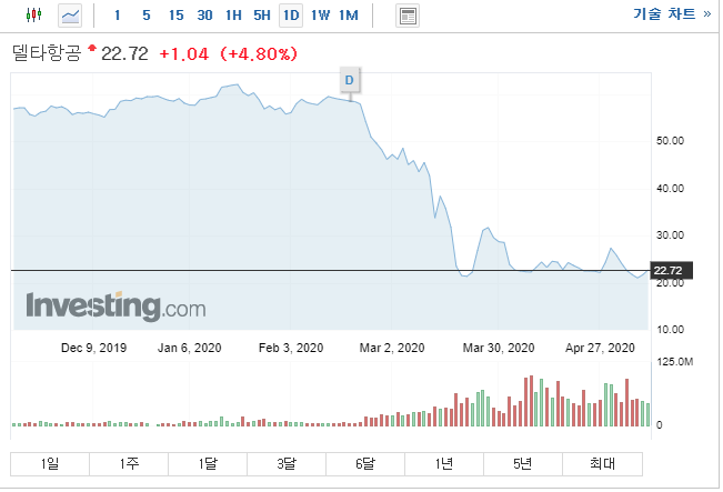 델타항공이 그 중 하나였습니다. 60달러였던 주가가 코로나19로 19.1달러까지 떨어졌었고, 현재도 20달러 초반선을 유지하고 있습니다.