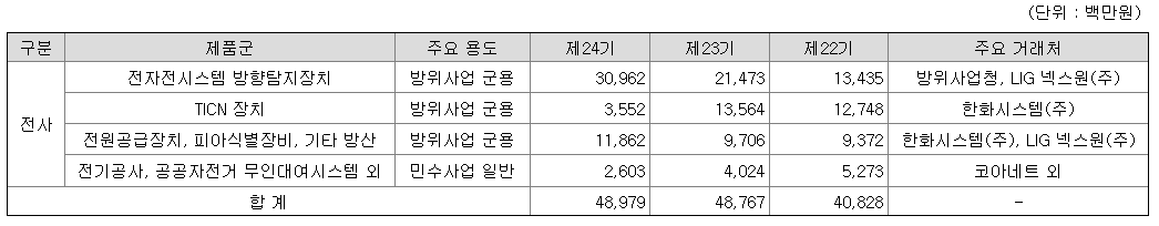 방위사업 및 군용 제품을 생산하기에 방위사업청, LIG넥스원, 한화시스템 등 방산업체와 거래를 진행중이며, 무인자전거 대여시스템의 경우 코아네트와 거래를 진행중이며 아직은 매출의 5% 정도 수준만을 유지하고 있습니다.
