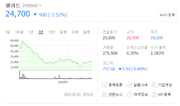 셀리드는 2006년 설립되었지만 상장은 2019년 2월에 되었습니다. 당시 엄청난 관심을 받으며 코스닥에 상장되었고, 장밋빛 전망만이 가득했으나 어느정도 하락세를 보여주고 있습니다.