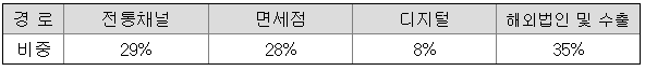 국내매출은 주로 전통채널과 면세점에서 발생합니다. 전통채널은 백화점, 방문판매, 전문점, 대리점 등이 포함됩니다. 해외시장의 성장에 따라 해외법인의 비중이 큰 만큼, 향후 발전에 있어서도 중요한 부분이 될 것 같습니다.