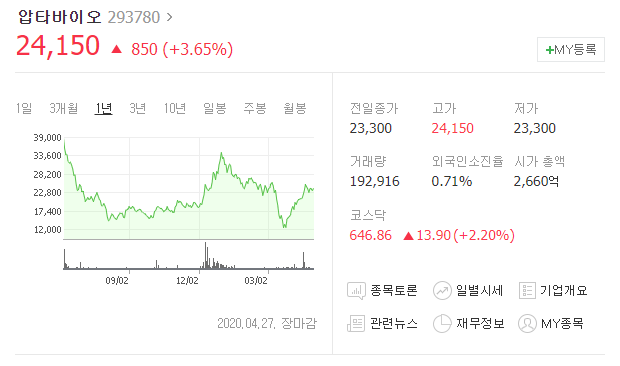 압타바이오가 아직까지는 좋은 매출을 내고있지 못하지만, 향후 성과를 통해 100배 이상의 매출을 달성할 수 있을 것이라 예상하는 사람들이 많습니다.