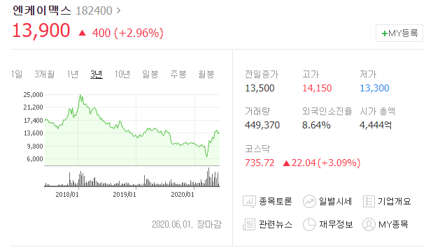 코스닥의 수많은 바이오기업들이 그러하듯, 엔케이맥스 역시 현재보다는 미래에 대한 가치를 인정받아 주가가 높아진 기업입니다.