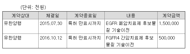 합 20억원 규모의 폐암 및 간암치료제 후보물질 기술이전을 통해 활발한 연구활동을 보여주고 있습니다