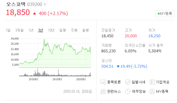 오스코텍의 주가를 보시면 18년 급등한 이래로 약간의 하락을 맞이하고 있습니다