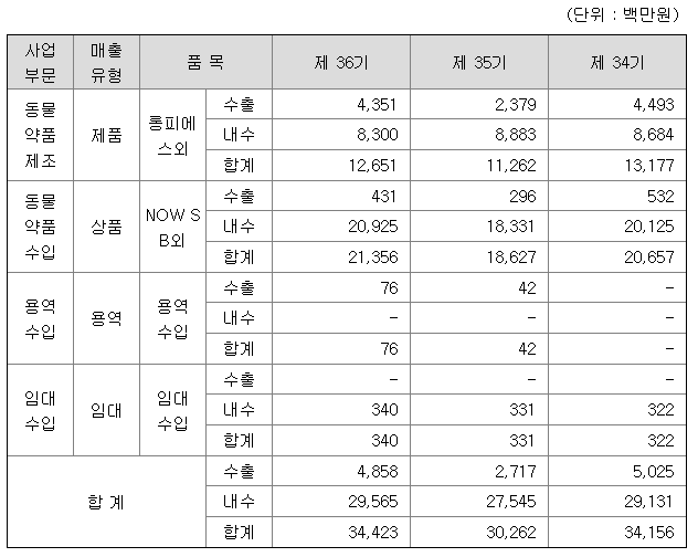 매출액은 동물약품 업계 상위권에 위치하고 있으며, 제품군에서도 소, 돼지, 닭 뿐만 아니라 반려동물까지 다양한 범위를 커버하는 능력을 보여주고 있습니다.