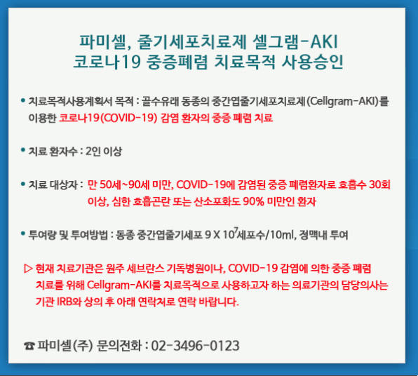 파미셀이 코로나19 관련주가 된 이유는 줄기세포치료제 Hearticellgram-AMI가 식품의약품안전처로부터 치료목적 사용승인을 받았기 때문입니다.