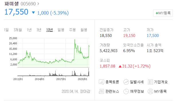 또한 코로나19 치료제미국 길리어드 사이언스가 개발한 렘데시비르의 주원료인 뉴클레오시드를 생산하는 기업이 파미셀이기에 렘데시비르 관련주로 분류되면서 시장에서 주목받는 기업입니다.
