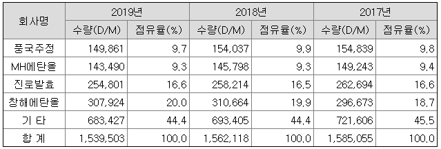 한국주류산업협회에서 공개한 자료에 의하면 풍국주정은 국내 주정시장에서 10% 수준의 점유율을 보여주며 4위권에 위치하고 있습니다.
