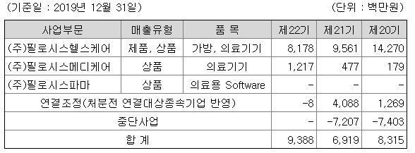 유통사업에서는 해외유명브랜드 가방 등의 수입을 통한 도소매 사업을 운영중입니다. 필로시스헬스케어는 코치, 키플링 등의 해외 유명브랜드의 수입을 통한 홈쇼칭 및 인터넷판매를 통한 유통사업도 진행중입니다.