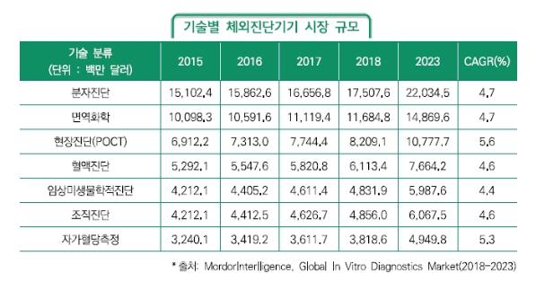 체외진단산업은 고령화 시대에 맞추어 한 단계 성장할 것으로 전망됩니다. 고령화가 진행되고 있고, 웰빙 등 건강에 대한 관심이 높아짐에 따라 빠른 진단을 원하는 사람들의 수요가 늘어가고 있고, 이에 맞추어 시장도 엄청난 성장을 겪게 될 것으로 전망됩니다.