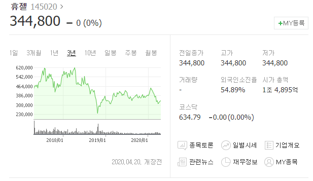 휴젤은 2001년 11월에 설립된 기업으로 코스닥에는 2015년에 상장된 코스닥에서 인정받는 강소기업입니다. 생물학적 제제 제조업으로 시가총액은 1조 4895억원에 매출액이 2045억에 달하는 성장 가능성을 지닌 기업입니다.