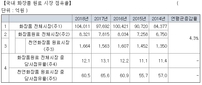 SK바이오랜드는 국내 화장품 원료 시장에서 10% 초반의 점유율을 유지하는 기업이고, 천연화장품 원료시장에서는 60% 수준의 점유율을 차지하는 기업입니다.