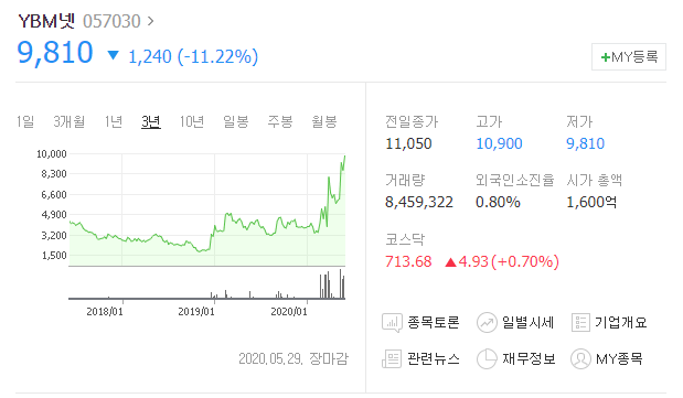 오늘 알아볼 기업은 ybm넷입니다. 온라인교육 관련주로 분류되는 기업이고, 개학연기, 교육정책 발표 등 교육관련 이슈가 발생할때마다 주가가 심하게 움직이는 기업입니다.