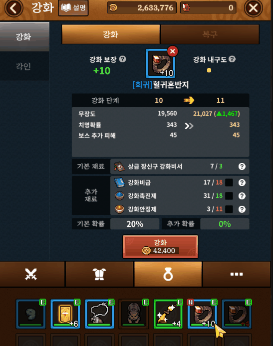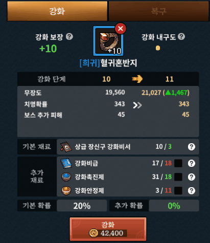 따단!!! 강화확률 20% 보이시나요... 10강 혈귀혼 반지 드디어 11강으로 올리기 위해 등록을 하였습니다. 성공률이 너무 낮아서 성공할것 같지가 않아요... 제발 되면 좋겠는데 안되면뭐 어쩔수없죠. 벌써부터 긴장감이 느껴지네요. 이걸 성공한다면 11강에 성공한다는 그 기쁨을 누릴수 있을것만 같아요.
