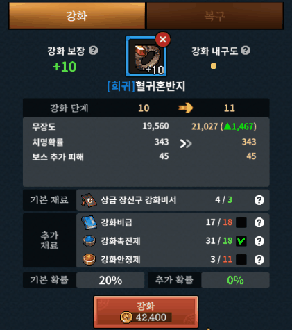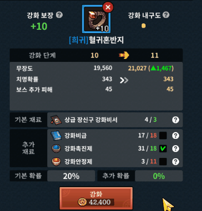 10강 반지 등록화면입니다. 강화비용은 42,400 금전에, 상급 장신구 강화비서 3개를 사용해야 합니다. 상급 장신구 강화비서는 아직까지 잘 사용하는 컨텐츠가 없을 정도로 나오지도 않고 사용도 잘 되지 않는 비서입니다. 무장도를 1400밖에 올려주지 않지만 좋은 경험이라 생각하고 강화를 진행했습니다.