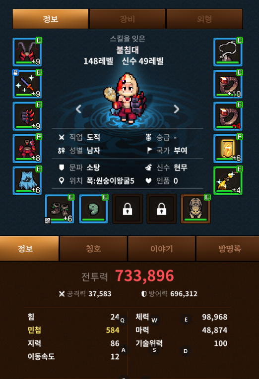 오늘도 바람의나라 연 하자서버에서 열렙중입니다. 첫 포스팅할때가 22만 도적이었는데, 50만을 넘어 어느덧 73만까지 올랐어요. 빨리 산적굴이랑 1차 승급이 나와야되는데 업데이트가 많이 느리네요... 그래도 산적굴 최소레벨이랑 사냥터에서 밀리지 않도록 일단은!! 열렙중입니다. 역시 폭:원숭이왕굴에서 4인 파티사냥하는게 폭업의 지름길이네요!