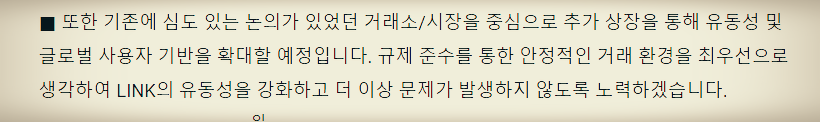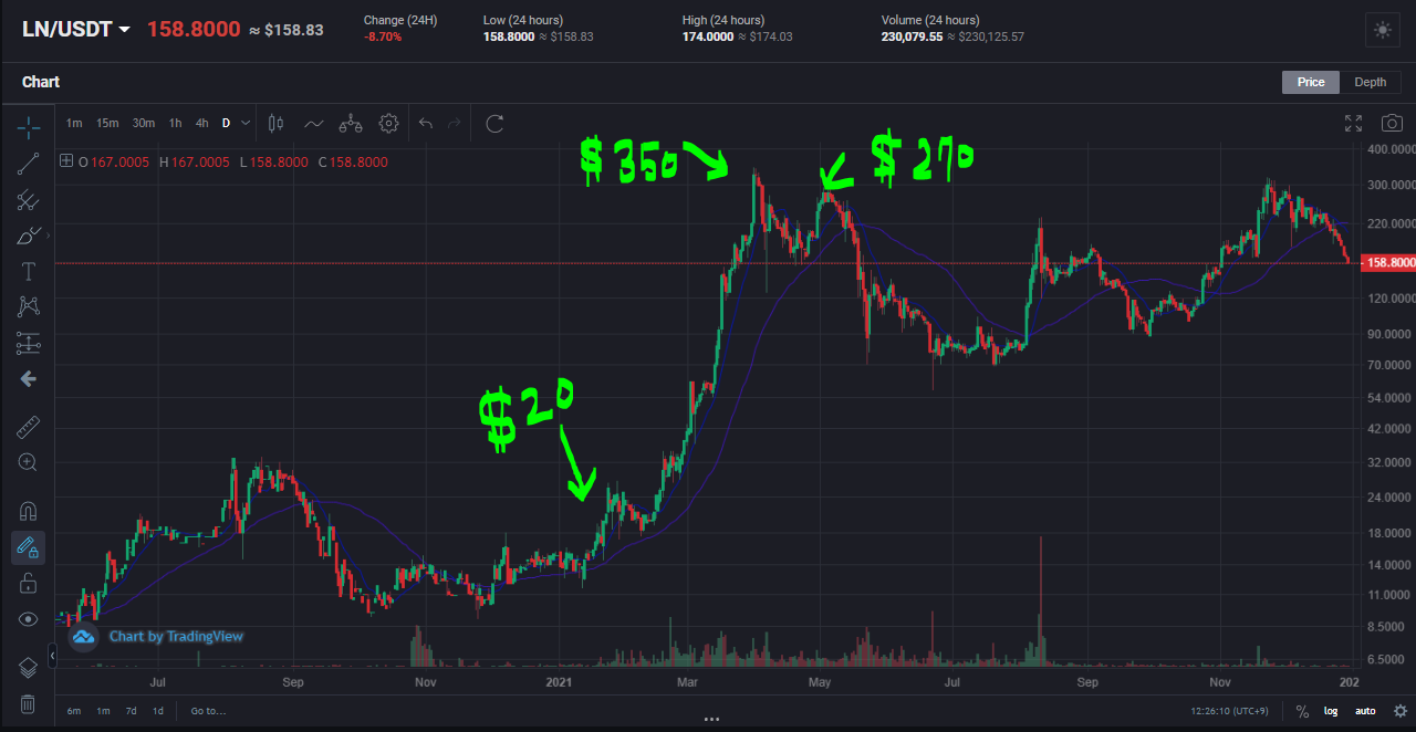 여기까지였습니다. 모두가 기대하던 LN의 모습은 보여지지 않았습니다. 네이버와 라인, 그리고 소프트뱅크 야후까지 연결된 이 코인은 이미 일본 시장은 장악할 것이 확정적인 분위기였고, 이를 기반으로 라인뱅크, 제페토를 활용한 글로벌 진출까지 예상되었습니다. 라인블록체인의 대표가 2021년이 원년이 될 것이라는 발표를 한 만큼, 링크의 성장성에 대해서는 의심의 여지가 없었습니다.